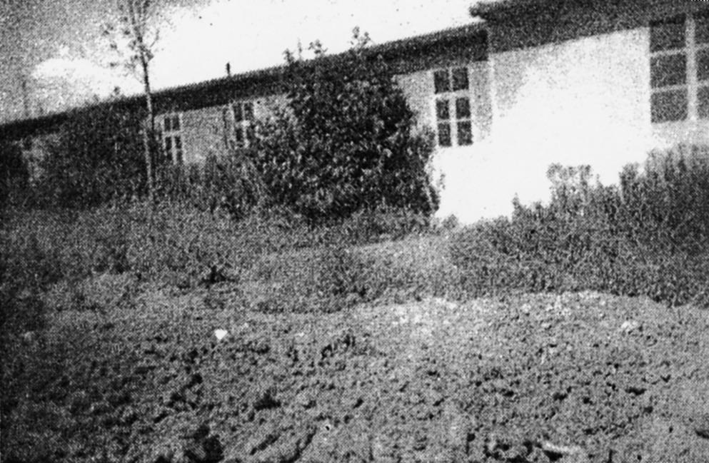 Ansicht eines SS-Mannschaftsbunkers von der SS-Lager-Seite aus. Auch hier waren die Bunkerwände mit einer Tarnbemalung versehen, die den Eindruck erwecken sollte, es handele sich um Baracken. Foto: unbekannt, nicht datiert (Nachkriegsaufnahme). (Privatbesitz Thirion)