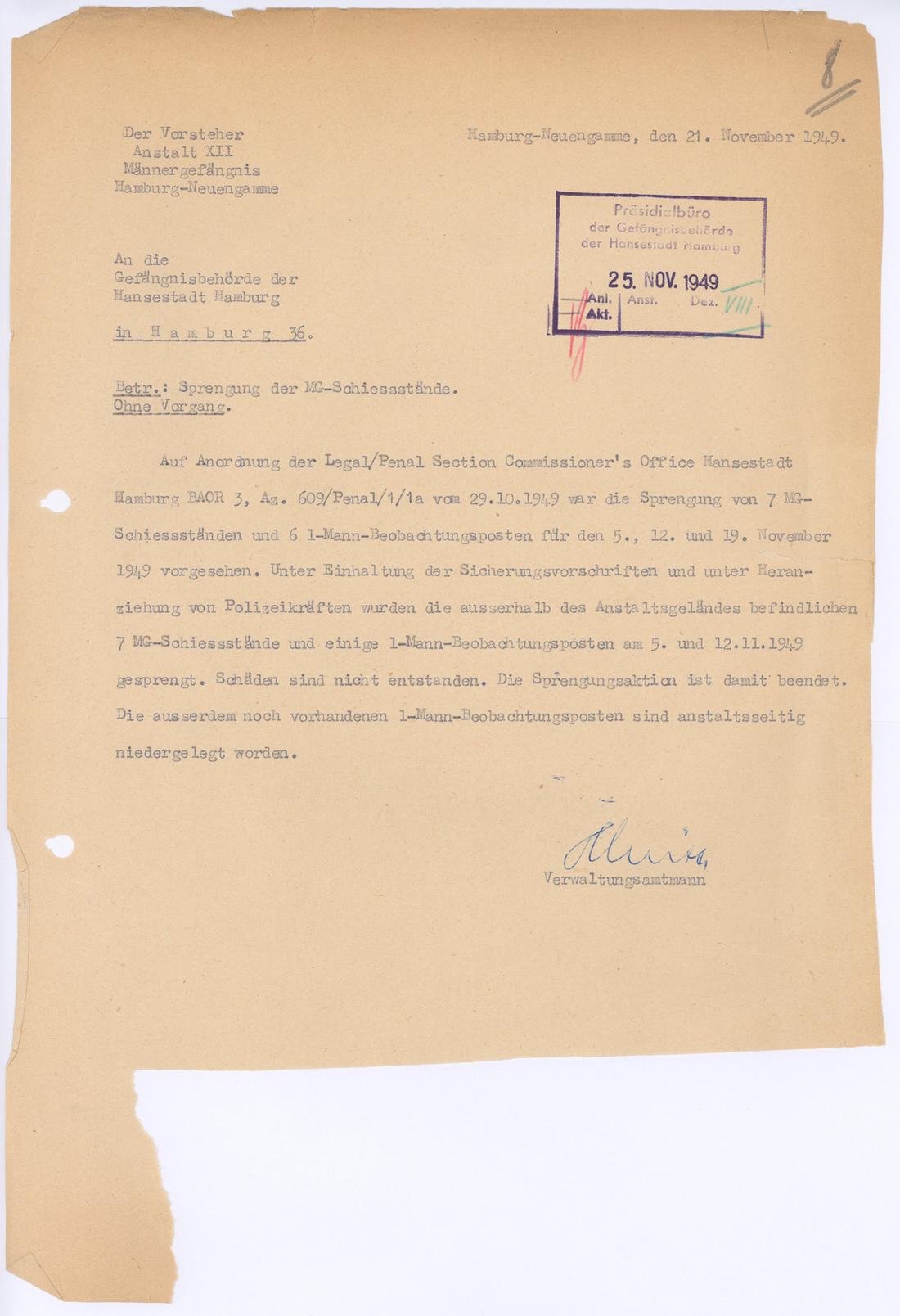Mitteilung des Leiters des Männergefängnisses Neuengamme, Fritz Schütt, dass die MG Unterstände und einige der Einmannbunker gesprengt worden seien, 21.11.1949. (JbH)