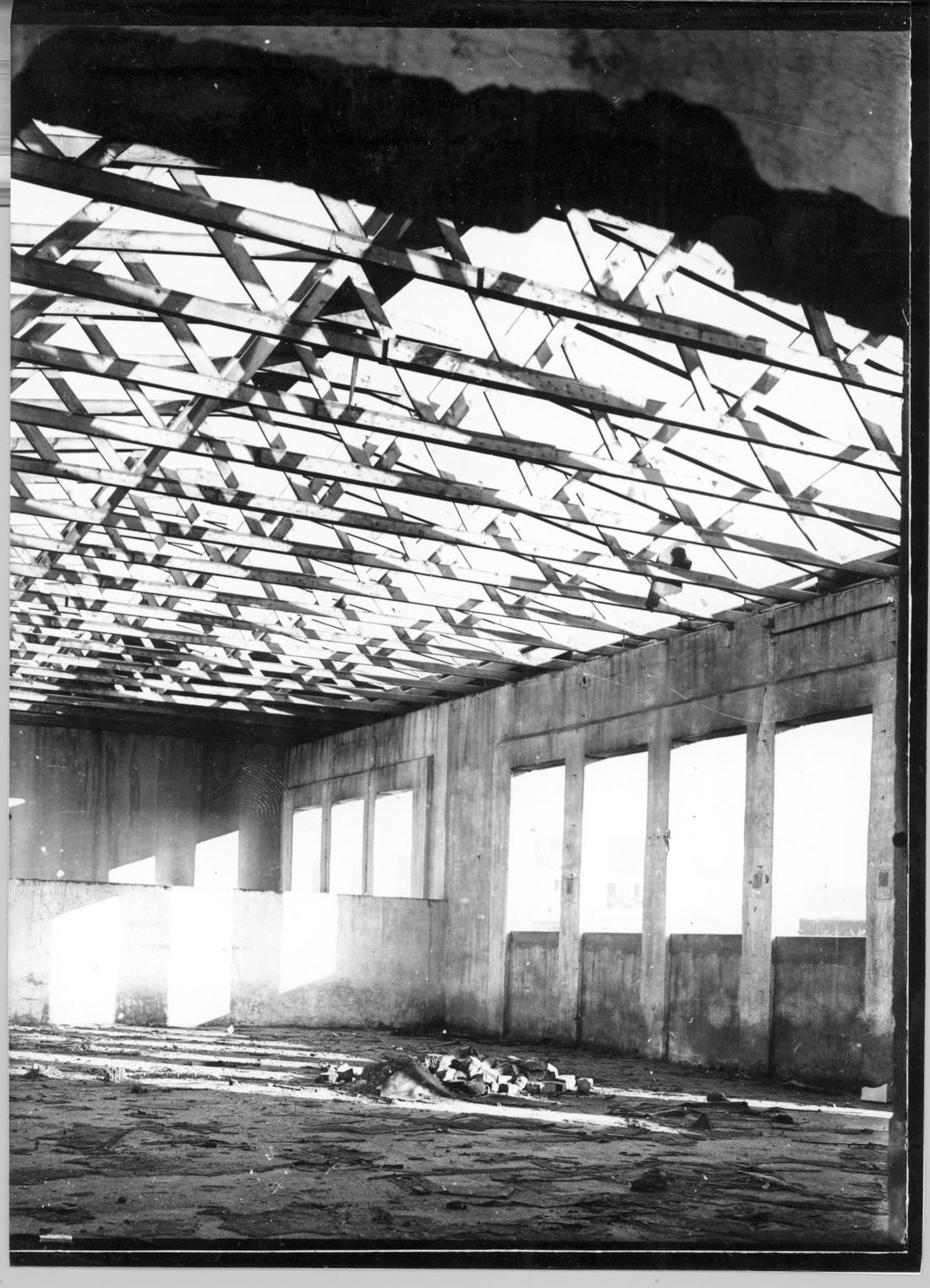 Eine verfallene Produktionsbaracke am ehemaligen Industriestandort Messap und Jastram. Foto: Strafvollzugsamt Hamburg, vermutlich 1948. (ANg)
