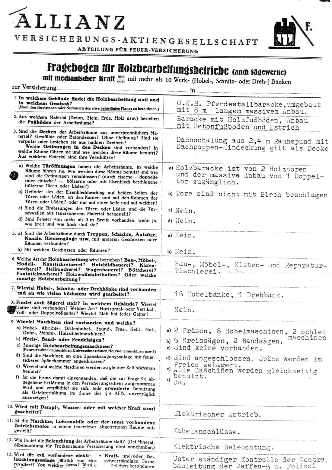 „Fragebogen für Holzverarbeitungsbetriebe“ der Allianz Versicherungs-AG. Detailiert wurde die Arbeitsbaracke III (Tischlerei) und die Maschinen für die Holzverarbeitung beschrieben, 24. März 1944. (BA-BDC)