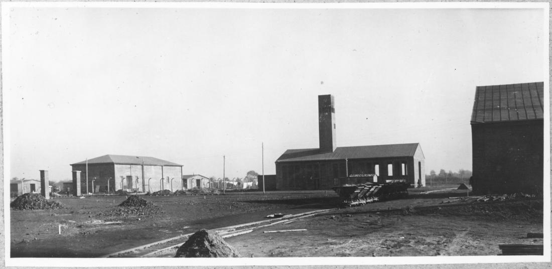 Westliche Ansicht des Heiz- und des Transformatorenhauses. Das Heizhaus ist im Rohbau fertig gestellt, die Fenster und das Tor fehlen noch. Links am Bildrand sind die Unterkunftsbaracken für Zivilangestellte der „Metallwerke Neuengamme“ („Walther-Werke“) im Rohbau und rechts das nördliche Ende des Querflügels der Produktionshalle zu erkennen. SS-Foto, nicht datiert. (ANg)