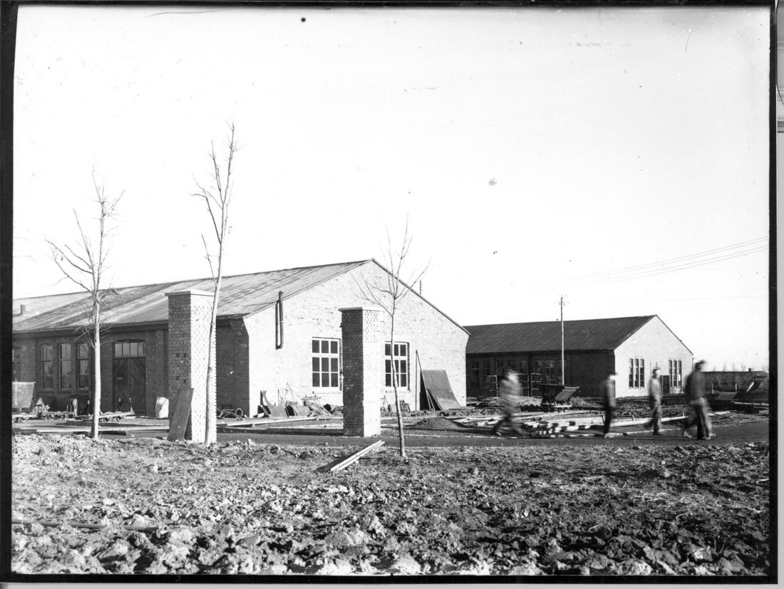 Südliche Teilansicht der „Metallwerke Neuengamme“ („Walther-Werke“), links ist das Gebäude der Tischlerei und rechts die Stirnseite des südliche Flügel erkennbar. Foto: Strafvollzugsamt Hamburg, vermutlich 1948. (ANg)