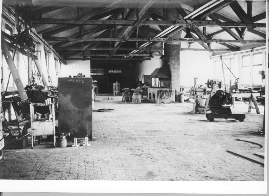 Blick in einen der Produktionsflügel der „Metallwerke Neuengamme“ („Walther-Werke“). Im Hintergrund ist eine Schmiedeesse zu erkennen. Foto: unbekannt, nicht datiert (Nachkriegsaufnahme). (ANg)