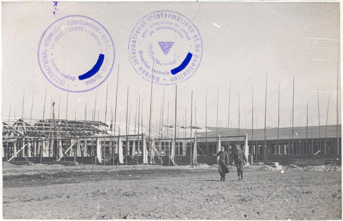 Bau der Produktionshalle der „Metallwerke Neuengamme“ („Walther-Werke“). Bei dem nordwestlichen Flügel sind die Pfosten bereits aufgestellt. Am linken Bildrand werden bei dem mittleren Haupttrakt die Dachlatten angebracht und das Dach mit Teerpappe gedeckt. SS-Foto aus dem so genannten Masset-Album, nicht datiert. (ANg)