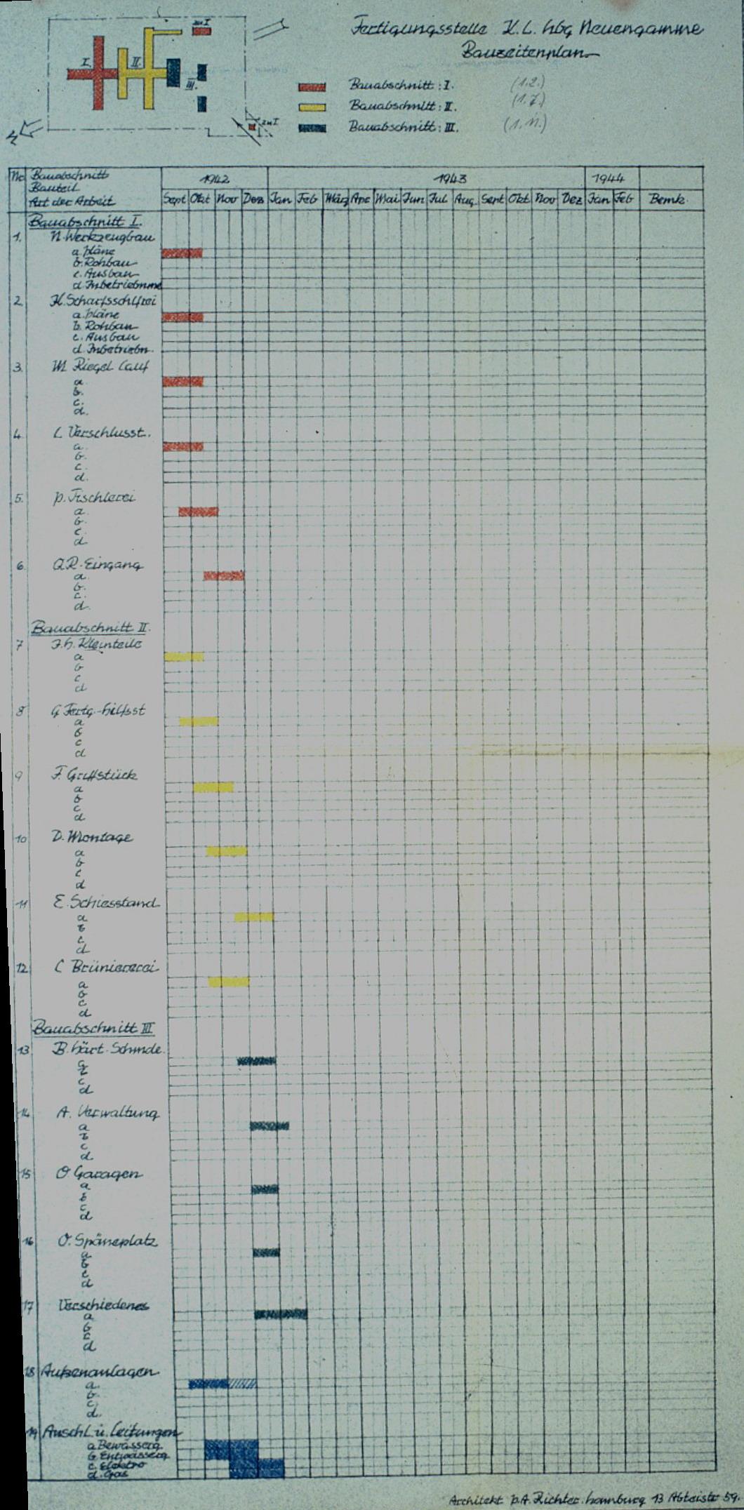 Bauzeitenplan der „Metallwerke Neuengamme“ („Walther-Werke“). Plan: Paul Alfred Richter, nicht datiert. (CChIDK)