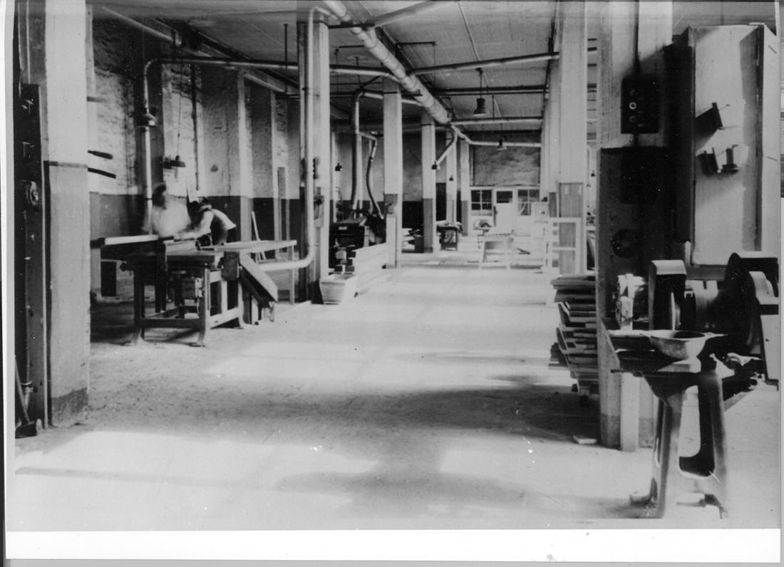 Blick in den Schmiederaum der ehemaligen „Metallwerke Neuengamme“ („Walther-Werke“). Zu erkennen ist das Stahlbetonstützenwerk. Die Rohre unter der Decke sind Bestandteil einer Spanabsaugung der im Männergefängnis Neuengamme eingerichteten Tischlerei. Foto: unbekannt, nicht datiert (Nachkriegsaufnahme). (ANg)