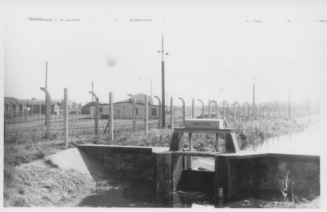 Westliche Ansicht des Kohlenbunkers. Im Vordergrund ist ein Regulierungsschott des Neuengammer Entwässerungsgrabensystems und im Hintergrund die Schmiede der Fertigungsstelle zu erkennen. Foto: unbekannt, 1949. (ANg)