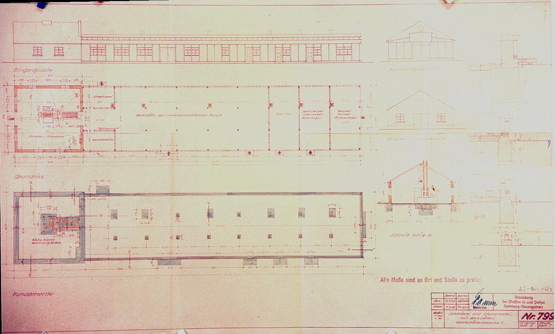 Entwurf Nr. 799 einer Schmiede (Werkstattbaracke 1). Plan: Bauleitung der Waffen-SS und Polizei Hamburg-Neuengamme, 7.3.1942. (CChIDK)