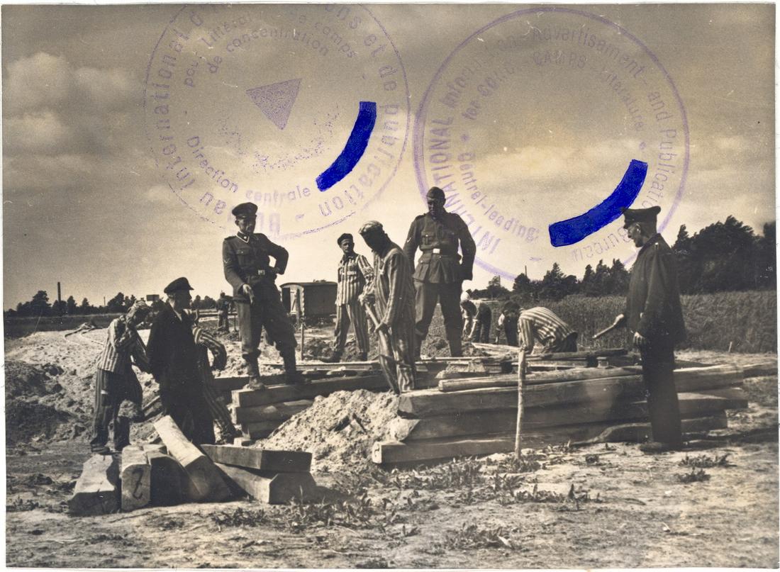 KZ-Häftlinge bei Gleisbauarbeiten. Die Fundamentierung der Schienentrasse wird vorbereitet. Im Vordergrund sind Eisenbahnschwellen zu erkennen. SS-Foto aus dem so genannten Masset-Album, nicht datiert. (ANg)