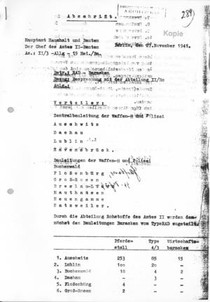 Die Zuteilung von Baracken im Nutzungsbereich der SS erfolgte bis zum 1. Februar 1942 durch die Abteilung Rohstoffe des Amtes II im HAHuB und danach durch die Rohstoffstelle der Amtsgruppe C im SS‑Wirtschafts-Verwaltungshauptamt (WVHA). So wurde beispielsweise im November 1941 der Bauleitung der Waffen‑SS und Polizei Neuengamme von der Abteilung Rohstoffe des Amtes II im HAHuB die Bereitstellung von vier RAD-Pferdestallbaracken angekündigt. Die Baracken sollten „in erster Linie bei der Errichtung von Kriegsgefangenenlagern Verwendung finden“ Jede Pferdestallbaracke war dabei für 400 Kriegsgefangene vorgesehen.