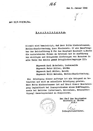 Als ein Beauftragter der Reichsführung SS für das HAHuB war ab Januar 1940 Fritz Niederstrasser für die Betreuung und Koordinierung der zugelassenen Firmen und für die Lieferung von Baracken in alle Teile des Reiches zuständig.