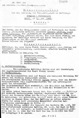 Im Rahmen der Einführung eines Prämiensystems zur „Leistungssteigerung“ von Häftlingen wurde ab Ende 1943 auch im KZ Neuengamme am Bau eines Häftlingsbordells geplant, das dann im April/Mai 1944 eingerichtet wurde.