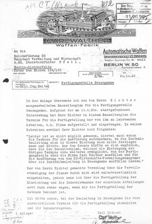 In einem Bauzeitenplan hatte der Architekt Paul Alfred Richter das in mehreren Teilabschnitten zu errichtende Bauvorhaben terminiert. Der erste Abschnitt (nördlicher Teil der Walther-Werke) sollte danach bereits am 1. Februar 1943, der zweite Abschnitt (südlicher Teil der Walther-Werke) am 1. Juli 1943 und der dritte Abschnitt (Schmiede) am 1. November 1943 fertig gestellt werden.